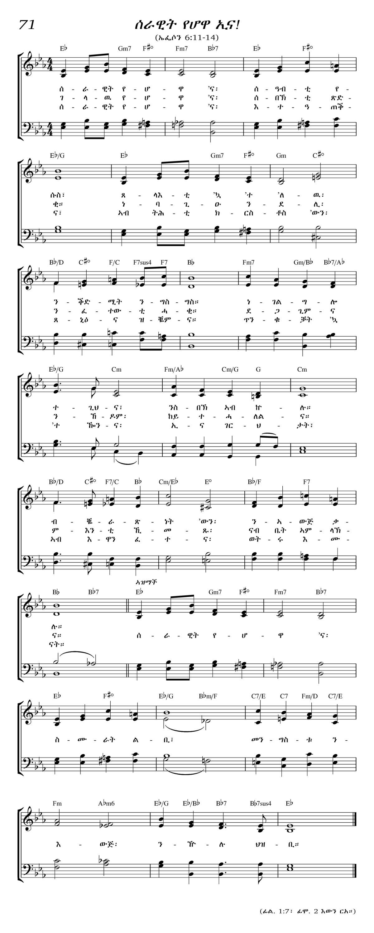 - 3. ሰራዊት የሆዋ’ና፡ - እተዓጠቕና፣ - ኣብ ትሕቲ ክርስቶስ’ውን፡ - ጸኒዕና ዝቘምና። - ጥንቁቓት ’ኳ ’ተ ዀንና፡ - ኢና ገርህታት፣ - ኣብ እዋን ፈተና፡ - ወትሩ እሙናት። - (ኣዝማች) - ሰራዊት የሆዋ’ና፡ - ስሙራት ልቢ፣ - መንግስቱ ንእውጅ፡ - ንዅሉ ህዝቢ።