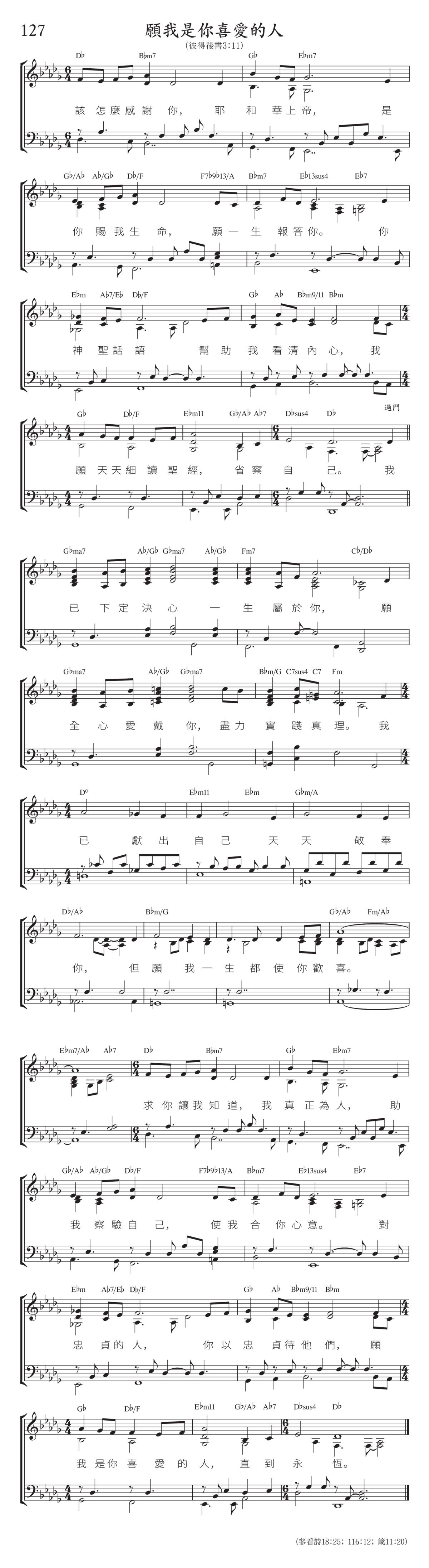 詩歌第127首 願我是你喜愛的人 閱讀印刷版 (彼得後書3:11) 1.該怎麼感謝你,耶和華上帝, 是你賜我生命,願一生報答你。 你神聖話語幫助我看清內心, 我願天天細讀聖經,省察自己。 (過門) 我已下定決心一生屬於你, 願全心愛戴你,盡力實踐真理。 我已獻出自己天天敬奉你, 但願我一生都使你歡喜。 求你讓我知道,我真正為人, 助我察驗自己,使我合你心意。 對忠貞的人,你以忠貞待他們, 願我是你喜愛的人,直到永恆。 (參看詩18:25;116:12;箴11:20)