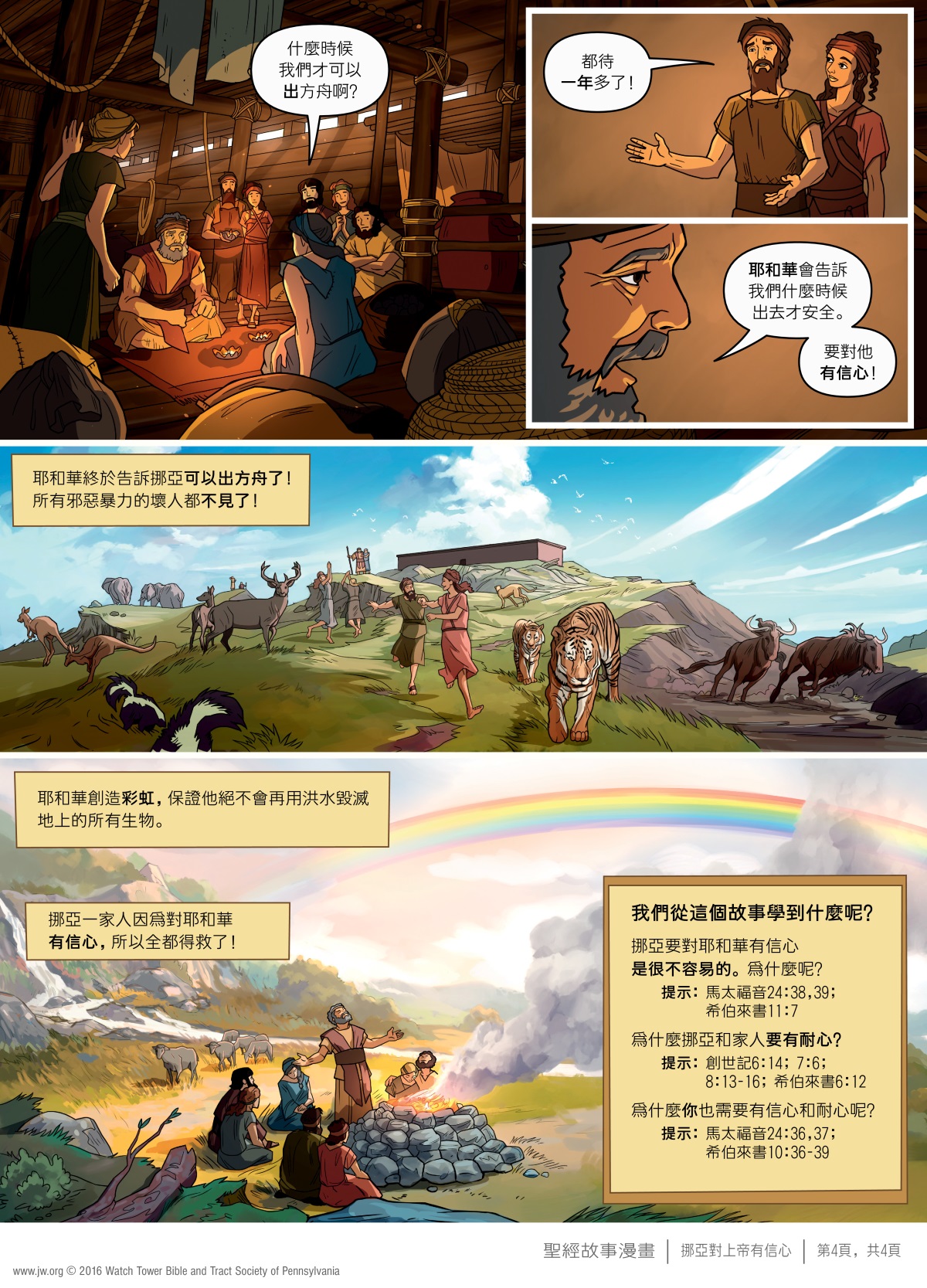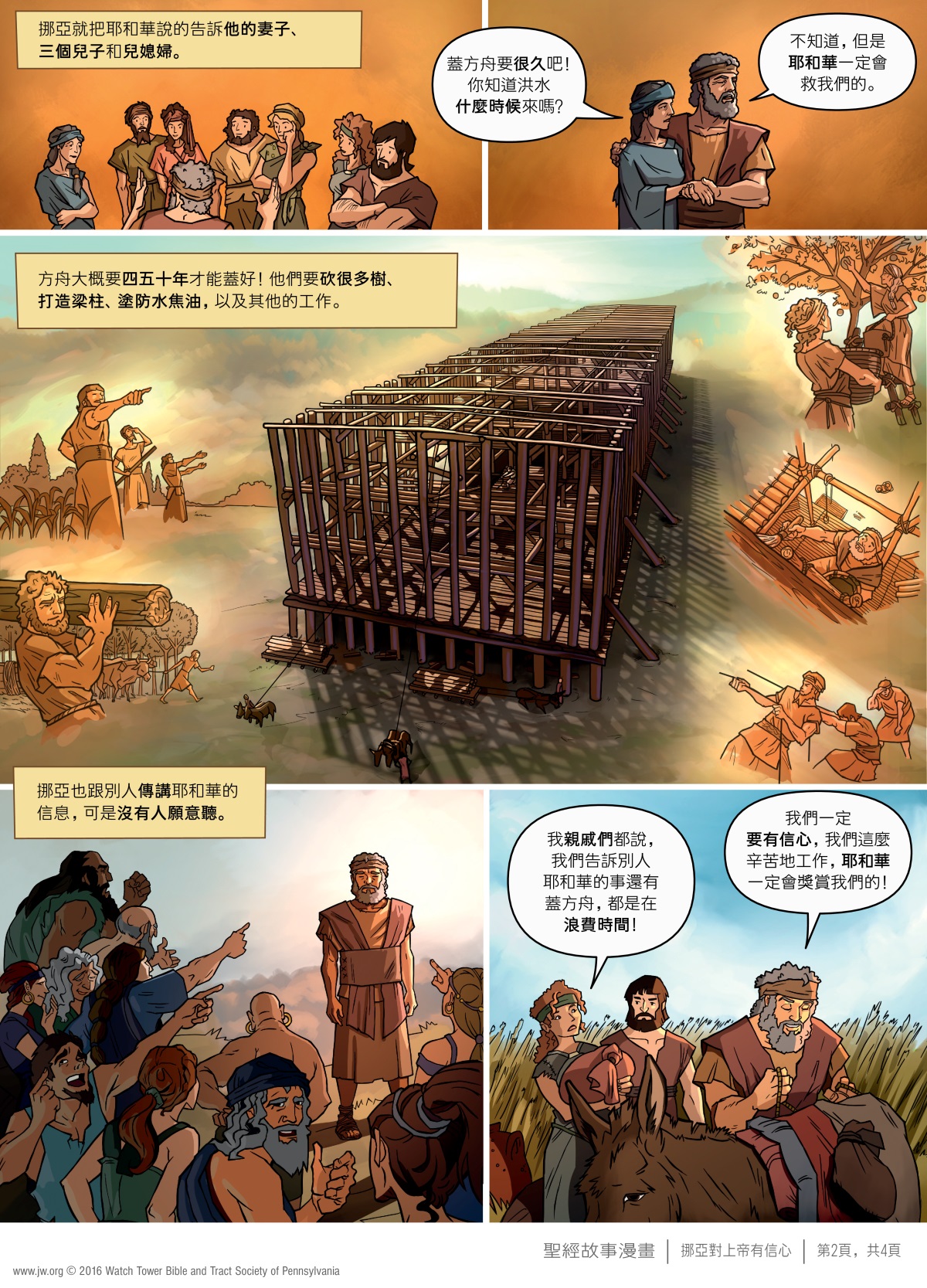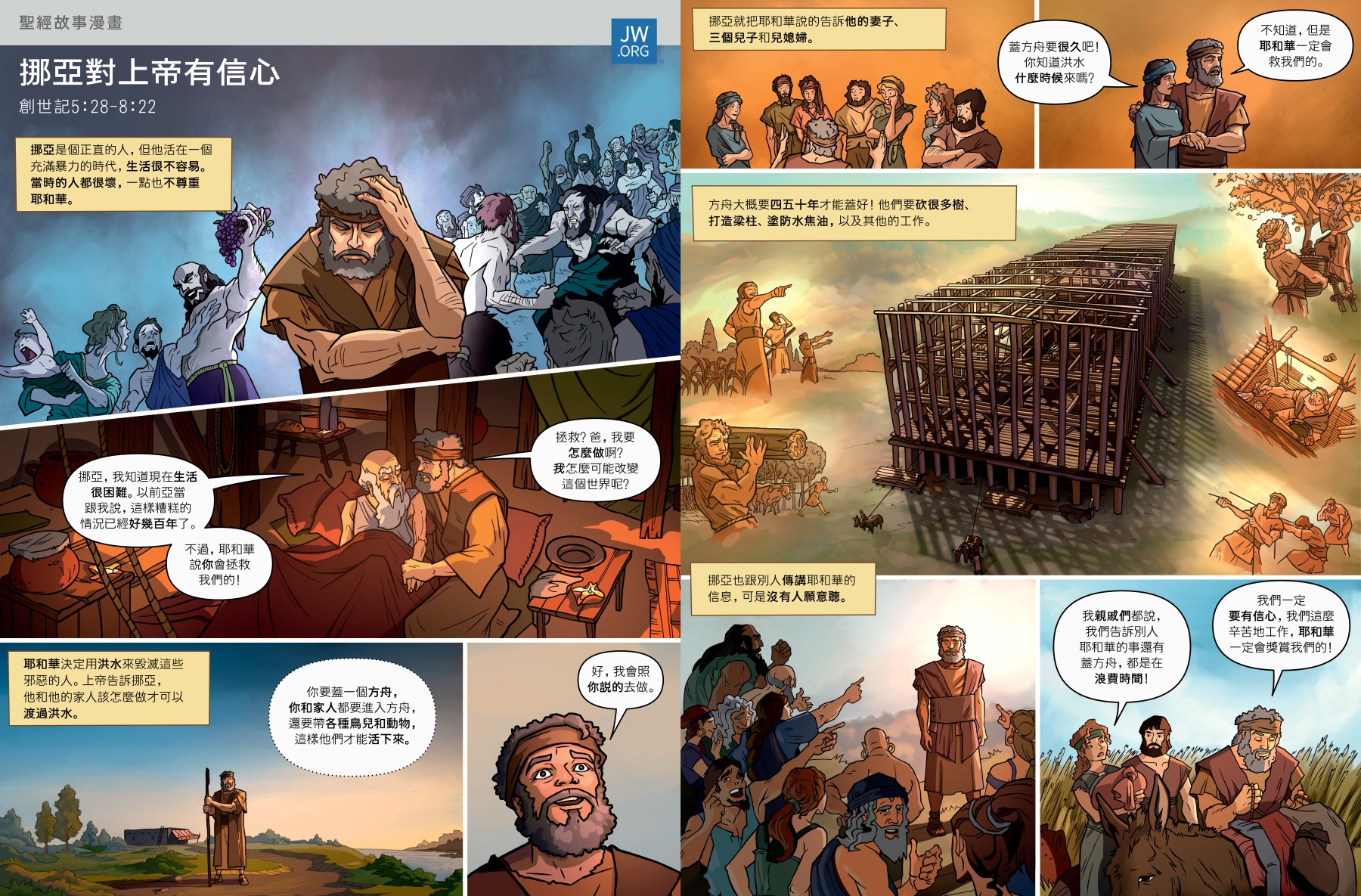 挪亞蓋了一個很大的方舟,救了全家人和動物。來看看這個聖經故事漫畫多一點了解挪亞。