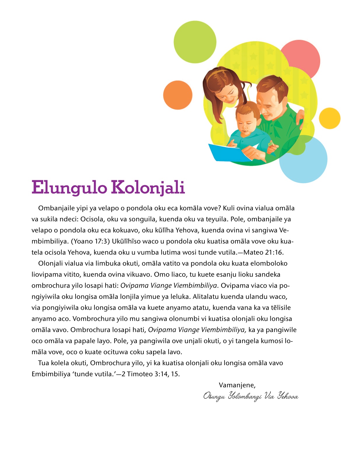 Olonjali vialua via limbuka okuti, omãla vavo vatito, vopa vali esilivilo kovolandu kuenda kovopange ana ateta onimbu. Omo liaco, tu kuete esanju lioku vu angiliyila ombrochura yilo Ovipama Viange Viembimbiliya. Ocipama locipama ca pangiwa locimãho coku longisa lonjila ya leluka. Ovisonehua loviluvialuvia, via pangiwila vali omãla va kuete anyamo atatu, ale vana ka va tẽlisile anyamo aco . Mua kongeliwavo olonepa vioku linga ovopange amue. Ombrochura Ovipama Viange Viembimbiliya, hacikuatacimueko coku papala laco, pole, ya pongiyiwila oco ove lomãla vove vu yi tangeli kumosi okuti, yi ku vetiyi oku sapela pokati.
