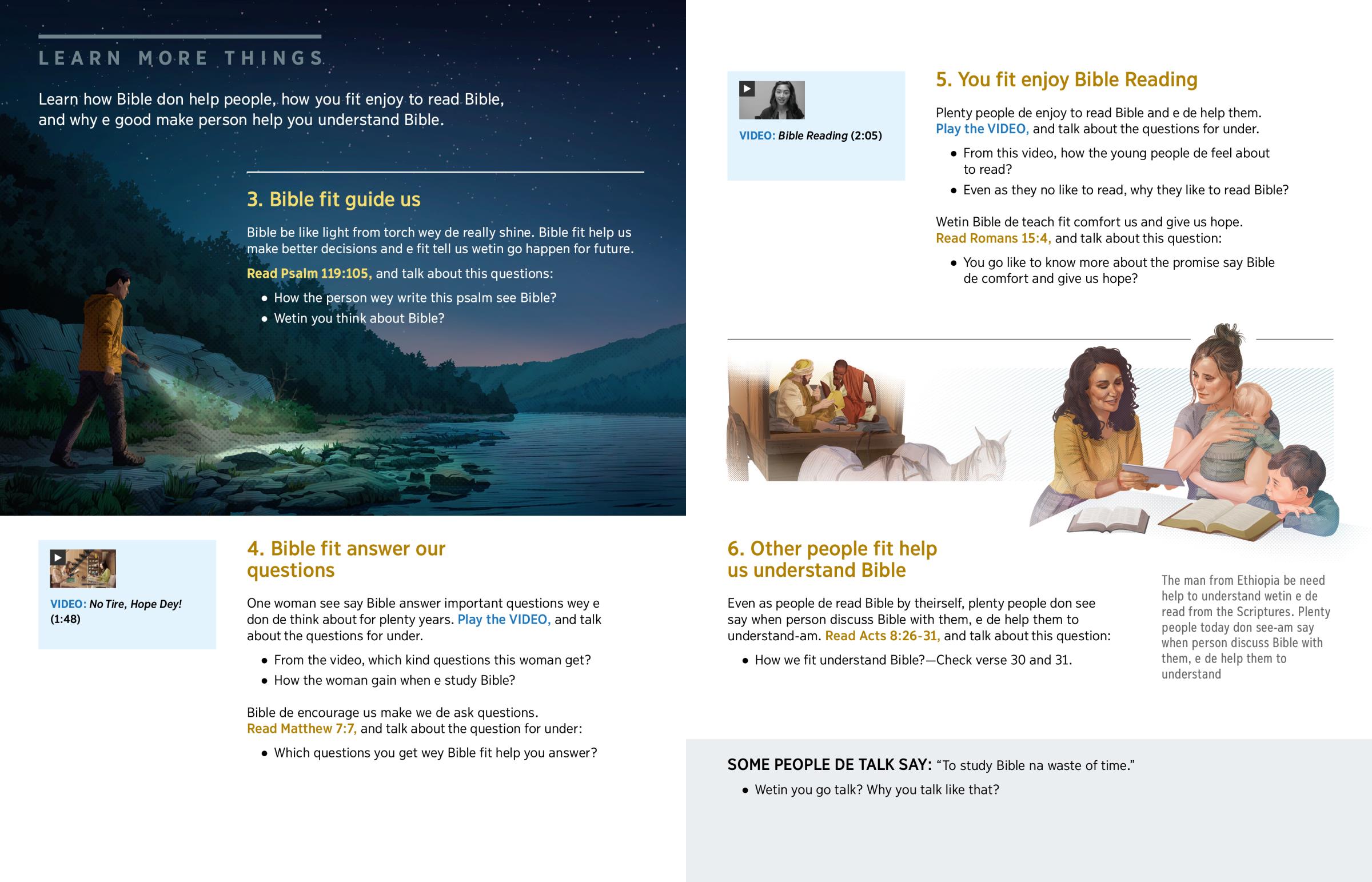 Plenty people de enjoy to read Bible and e de help them. Play the VIDEO, and talk about the questions for under.