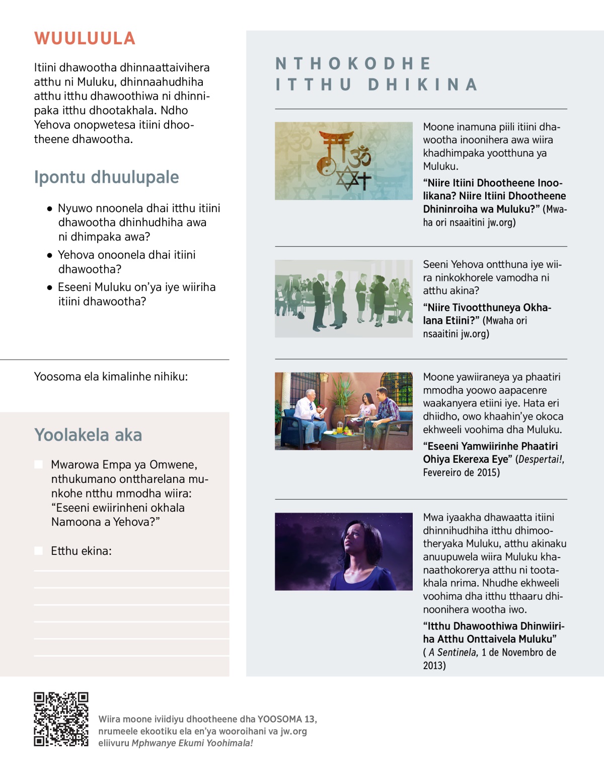 “Niire Itiini Dhootheene Inoolikana? Niire Itiini Dhootheene Dhininroiha wa Muluku?” (Mwaha ori nsaaitini jw.org)