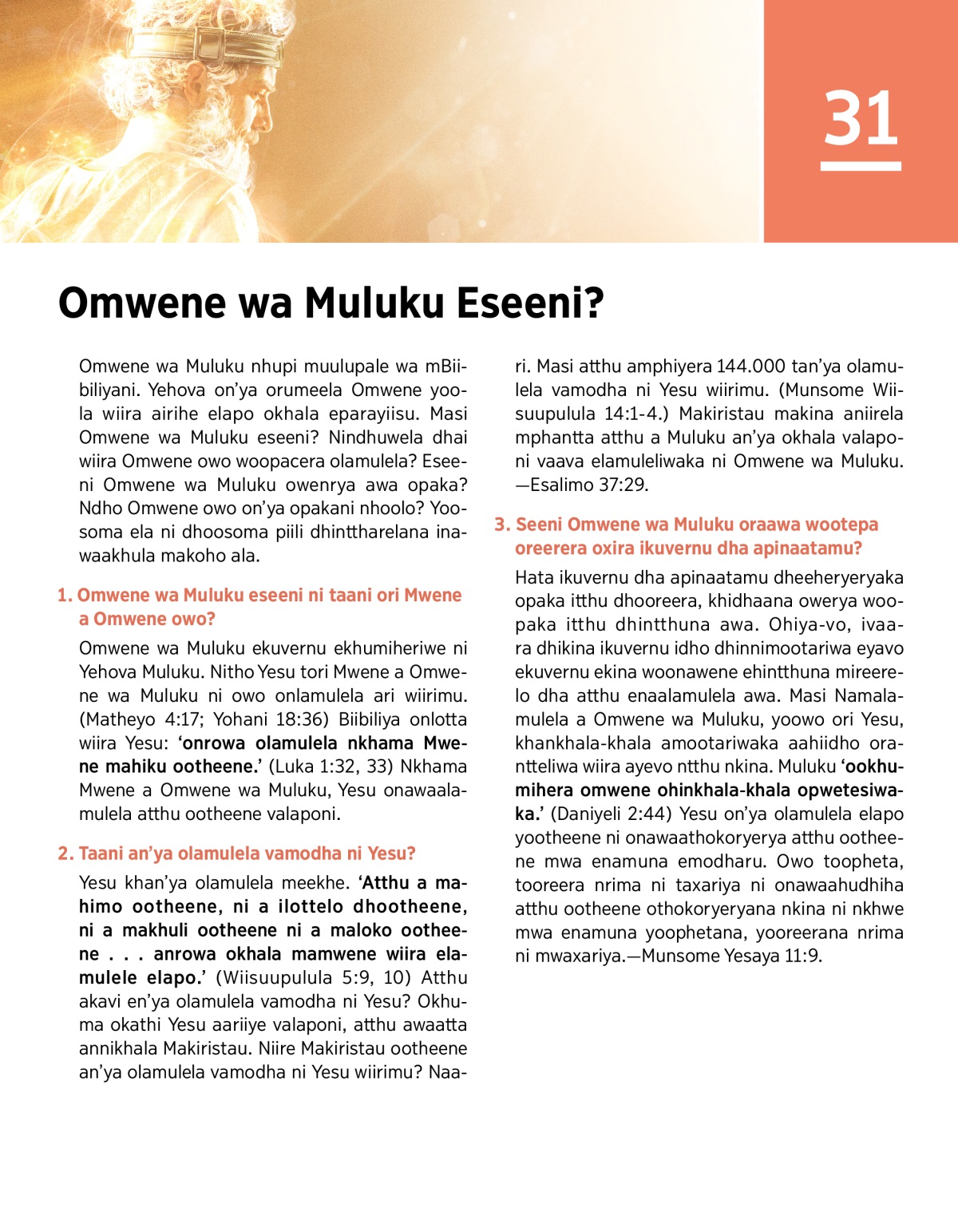 Omwene wa Muluku nhupi muulupale wa mBiibiliyani. Yehova on’ya orumeela Omwene yoola wiira airihe elapo okhala eparayiisu. Masi Omwene wa Muluku eseeni? Nindhuwela dhai wiira Omwene owo woopacera olamulela? Eseeni Omwene wa Muluku owenrya awa opaka? Ndho Omwene owo on’ya opakani nhoolo? Yoosoma ela ni dhoosoma piili dhinttharelana inawaakhula makoho ala.