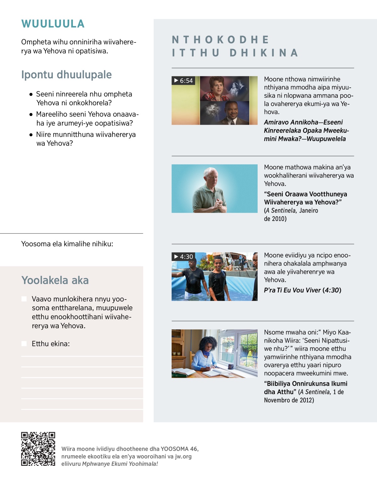 • Owo aahithanla wiivahererya wa Yehova, ohiya ommana poola. Nyuwo nnoona wiira owo opaka yoothanla yoorera? Mwaha wa seeni?