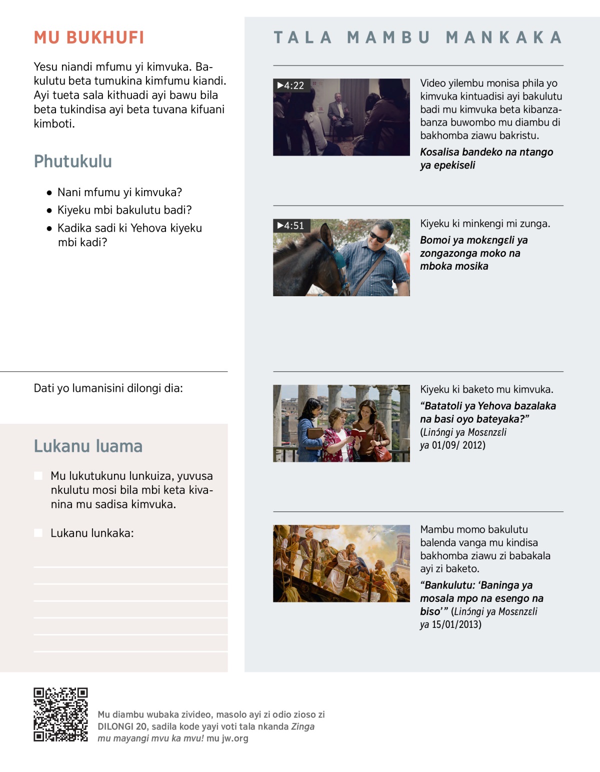 A. Montage : Nkulutu mosi wulembu yonzula nguizani’andi ayi Yehova ayi wulembu sadisa phe dikanda diandi diba nguizani yimboti ayi Yehova. 1. Wulembu sambila tuamina katanga Bibila. Ayi nketu’andi balembu longisa muan’awu wufioti wunketu Bibila. B. Nio niandi nkulutu beni ayi nketu’andi betadi phangi mosi wunketo nio widi ku nzo m’buku. C. Nio niandi diaka nkulutu beni wulembu samunina bakala dimosi vantuala nzu’andi. D. Montage : 1. Nio niandi diaka nkulutu beni wulembu tudi diskur mu lukutunu lu kimvuka. 2. Ayi wulembu pangusa Nzo yi kimfumu.