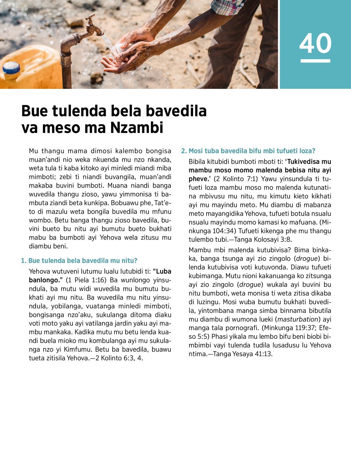 Bibila kitubidi bumboti mboti ti: ‘Tukivedisa mu mambu moso momo malenda bebisa nitu ayi pheve.’ (2 Kolinto 7:1) Yawu yinsundula ti tufueti loza mambu moso mo malenda kutunatina mbivusu mu nitu, mu kimutu kieto kikhati ayi mu mayindu meto. Mu diambu di mabanza meto mayangidika Yehova, tufueti botula nsualu nsualu mayindu momo kamasi ko mafuana. (Minkunga 104:34) Tufueti kikenga phe mu thangu tulembo tubi.—Tanga Kolosayi 3:8.