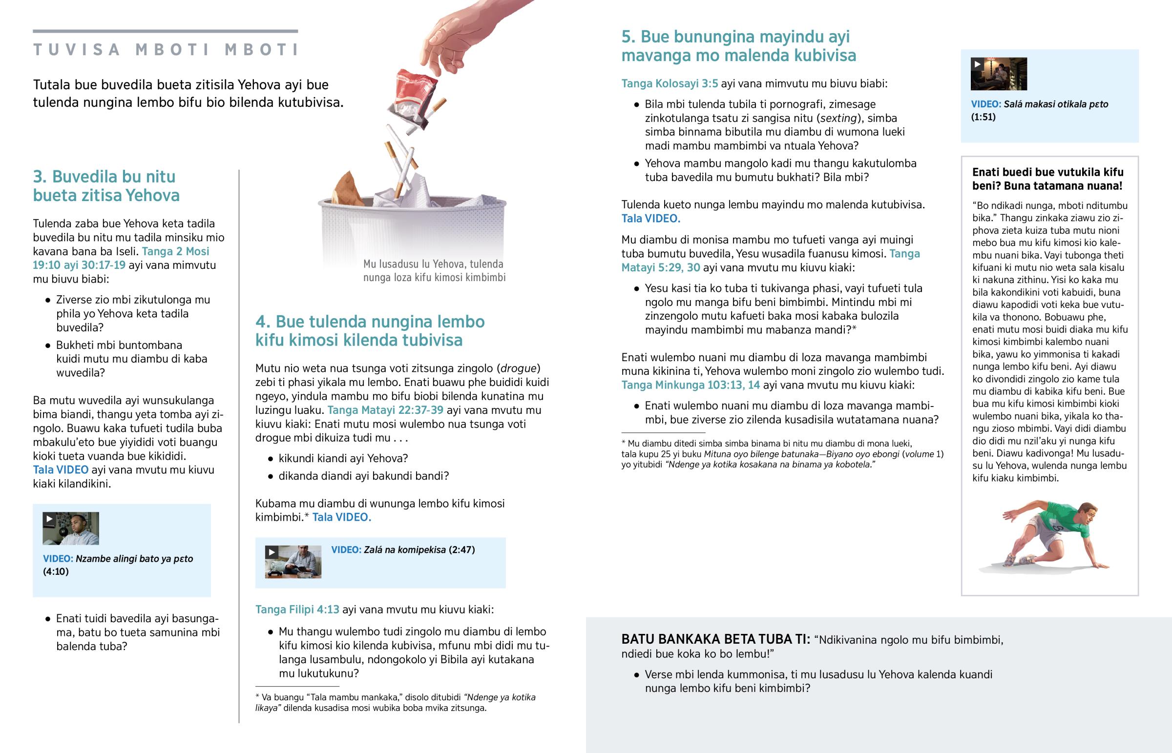 Mambu mbi malenda kutubivisa? Bima binkaka, banga tsunga ayi zio zingolo (drogue) bilenda kutubivisa voti kutuvonda. Diawu tufueti kubimanga. Mutu nioni kakanuanga ko zitsunga ayi zio zingolo (drogue) wukala ayi buvini bu nitu bumboti, weta monisa ti weta zitisa dikaba di luzingu. Mosi wuba bumutu bukhati buvedila, yintombana manga simba binnama bibutila mu diambu di wumona lueki (masturbation) ayi manga tala pornografi. (Minkunga 119:37; Efeso 5:5) Phasi yikala mu lembo bifu beni biobi bimbimbi vayi tulenda tudila lusadusu lu Yehova ntima.—Tanga Yesaya 41:13.