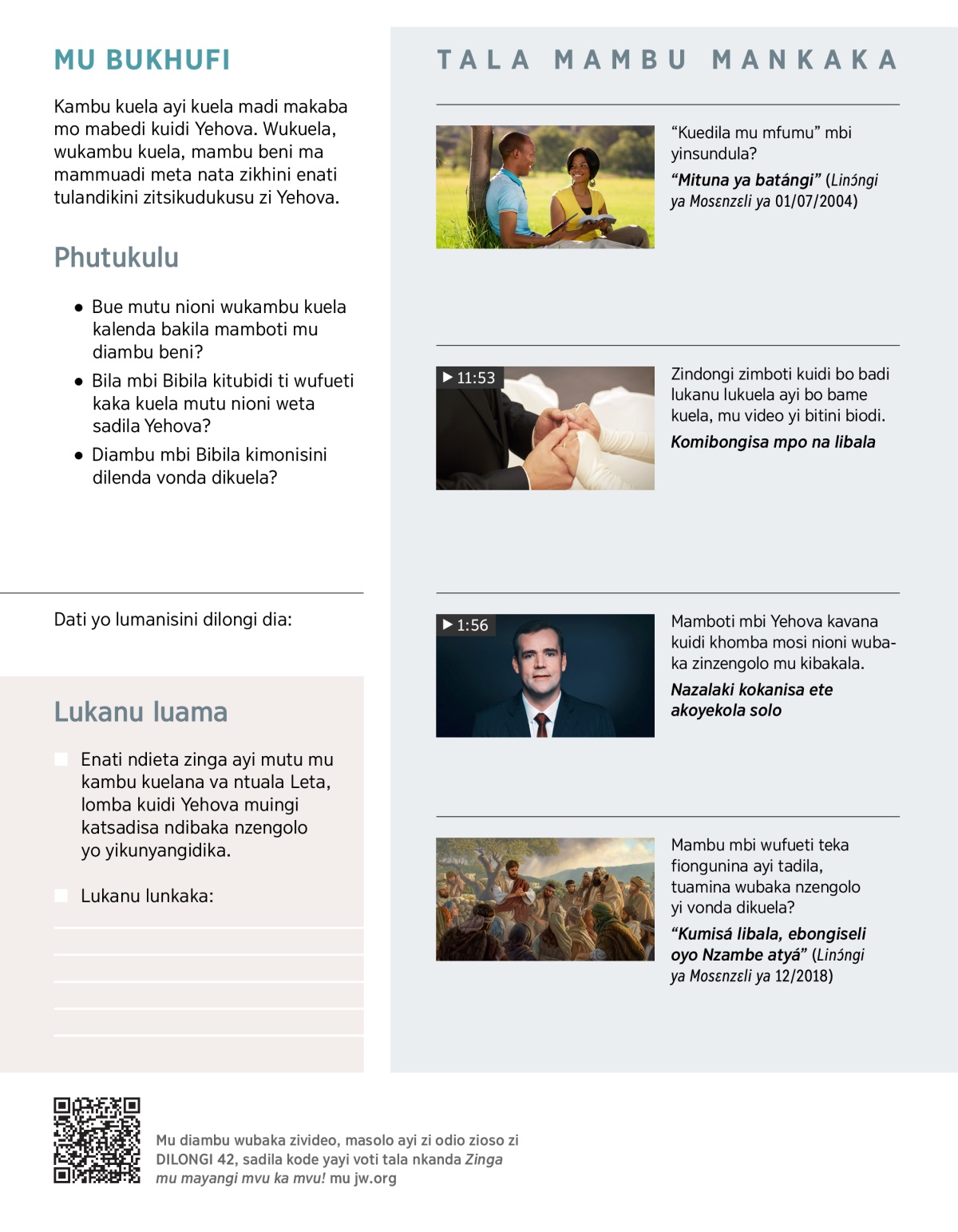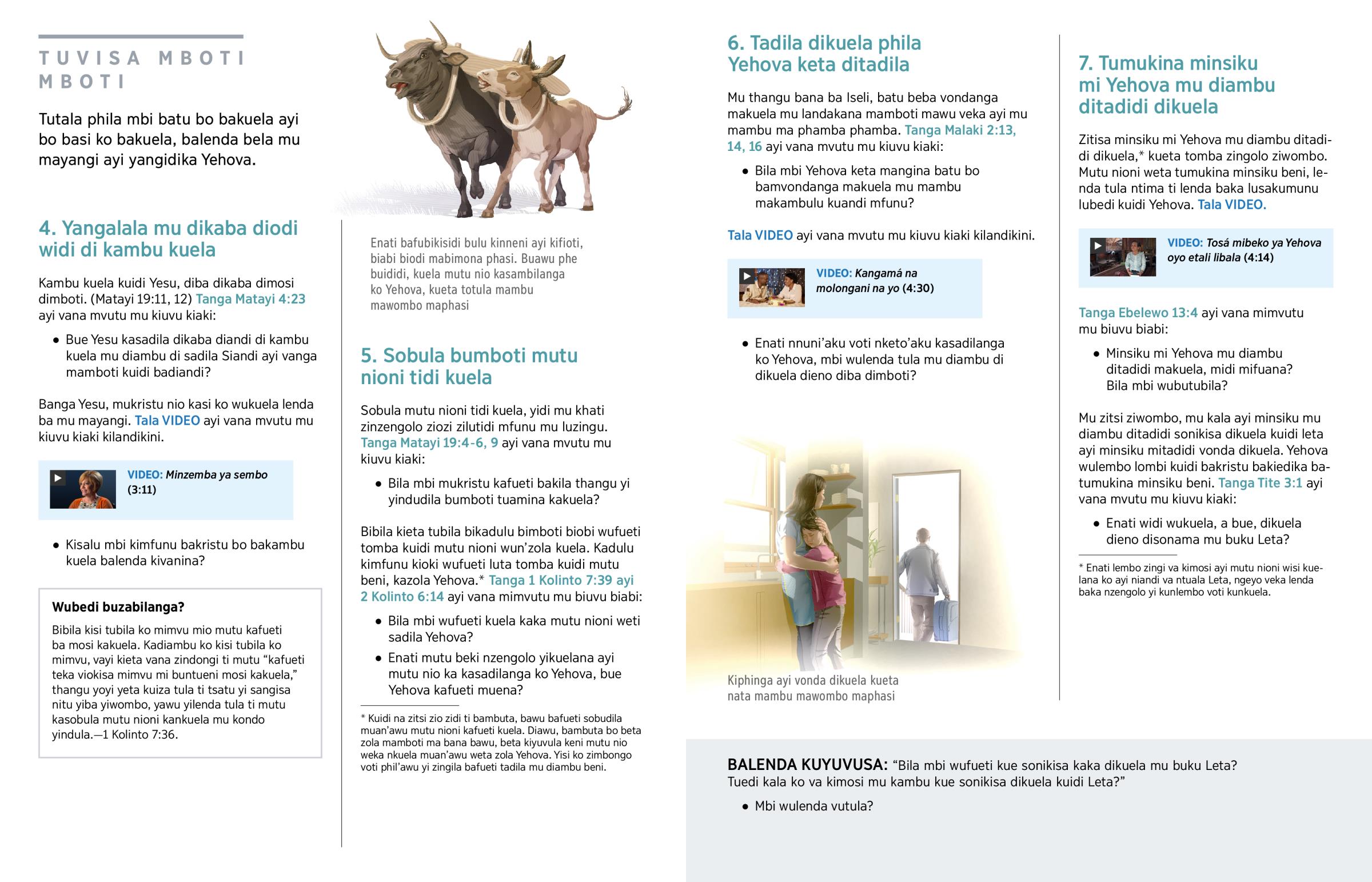 Tueta tanga mu Bibia ti: “Woso mutu kuedidi vengi diambu dimboti, ayi woso mutu mengi kuandi kuela vengi diambu dilutidi mboti.” (Tanga 1 Kolinto 7:32, 33, 38.) Bila mbi Bibila kitubidi ti mutu nio kambulu kuela vengi diambu “dilutidi mboti”? Mu kifuani, mu kondo phasi kalenda kuandi kue samuna koso kuandi kuma katidi, voti yoso kuandi tsi katidi kuenda. Mu buela, wukala ayi thangu yiwombo yi yonzudila kikundi kiandi ayi Yehova.