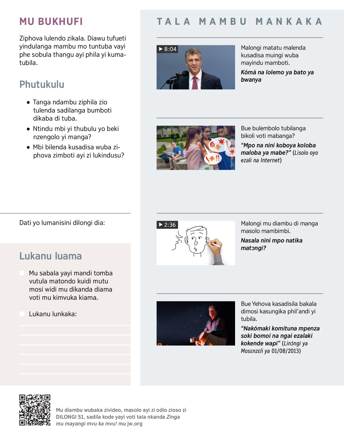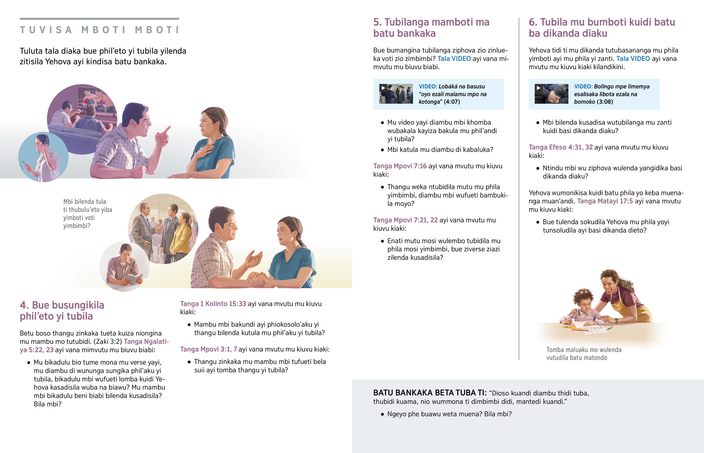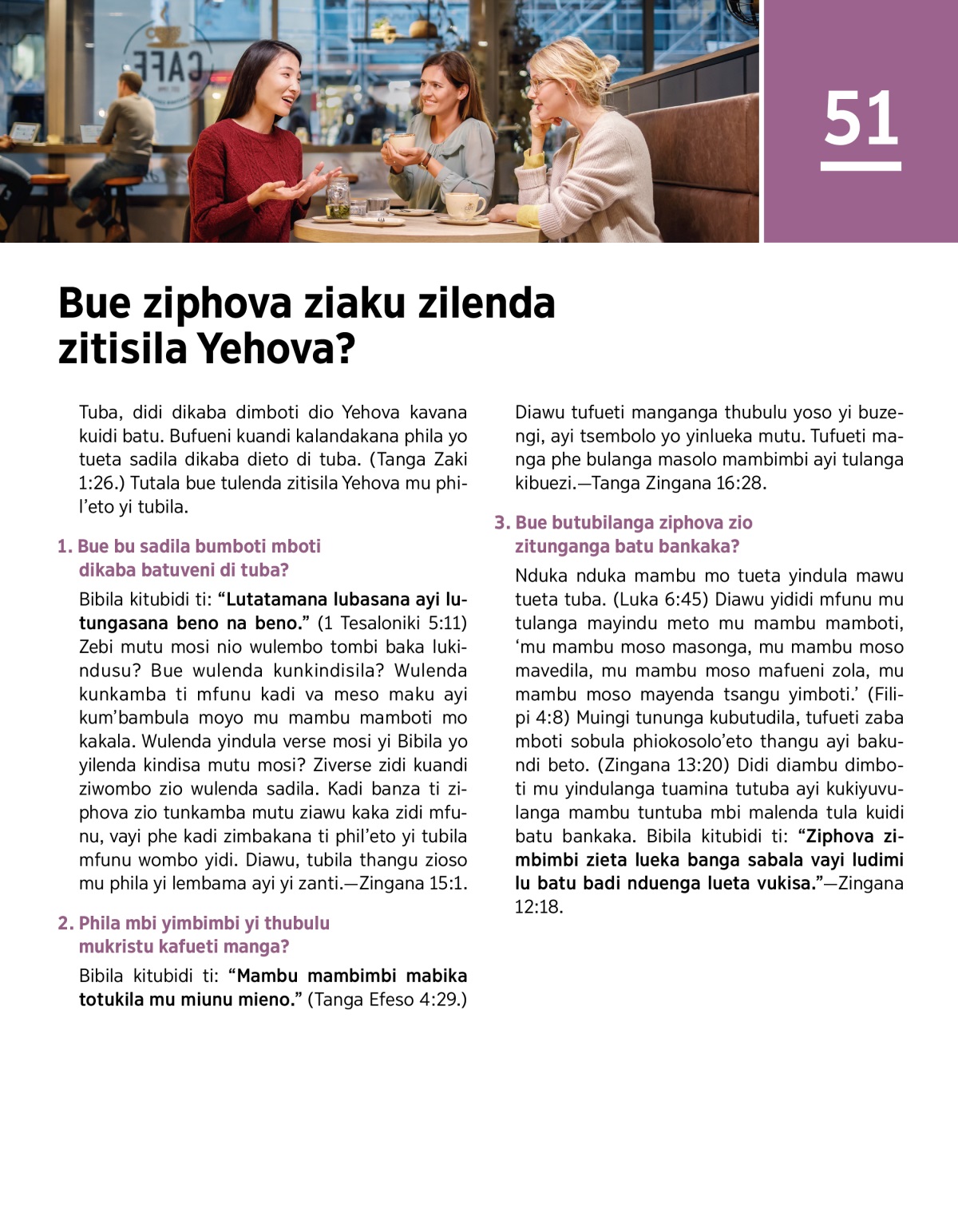 Bibila kitubidi ti: “Lutatamana lubasana ayi lutungasana beno na beno.” (1 Tesalonika 5:11) Zebi mutu mosi nio wulembo tombi baka lukindusu? Bue wulenda kunkindisila? Wulenda kunkamba ti mfunu kadi va meso maku ayi kum’bambula moyo mu mambu mamboti mo kakala. Wulenda yindula verse mosi yi Bibila yo yilenda kindisa mutu mosi? Ziverse zidi kuandi ziwombo zio wulenda sadila. Kadi banza ti ziphova zio tunkamba mutu ziawu kaka zidi mfunu, vayi phe kadi zimbakana ti phil’eto yi tubila mfunu wombo yidi. Diawu, tubila thangu zioso mu phila yi lembama ayi yi zanti.—Zingana 15:1.