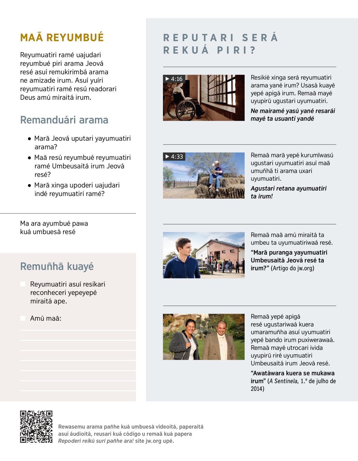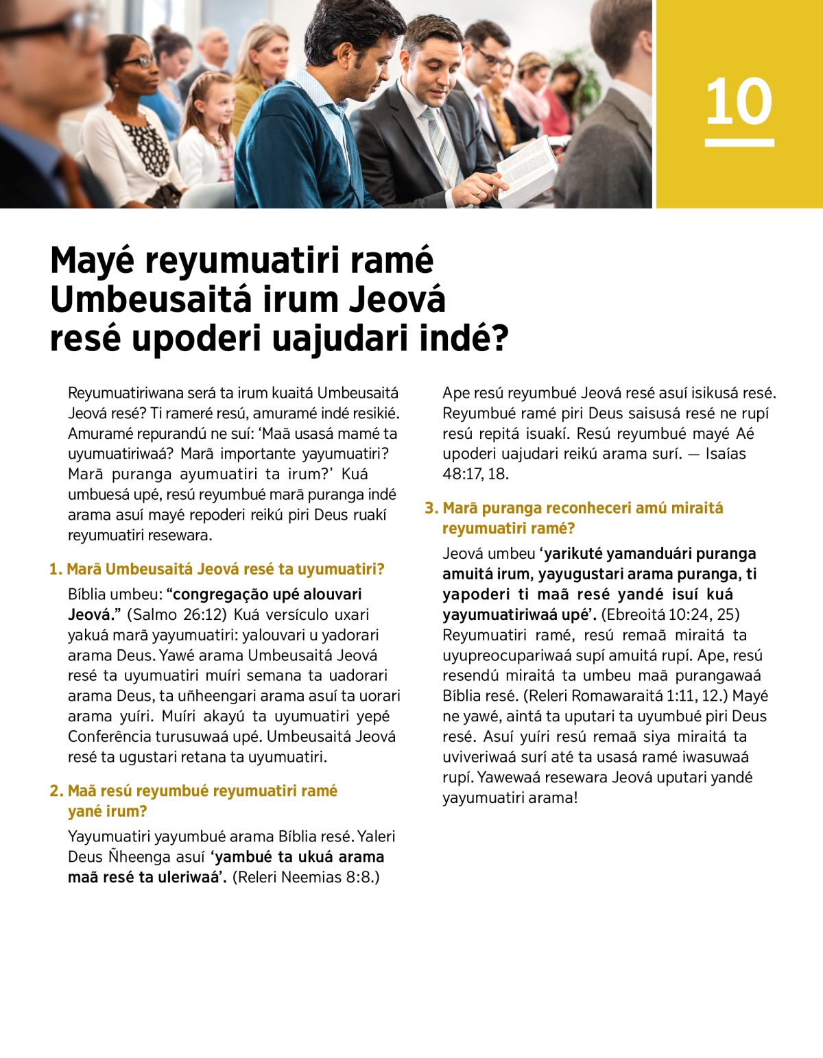 Jeová umbeu ‘yarikuté yamanduári puranga amuitá irum, yayugustari arama puranga, ti yapoderi ti maã resé yandé isuí kuá yayumuatiriwaá upé’. (Ebreoitá 10:24, 25) Reyumuatiri ramé, resú remaã miraitá ta uyupreocupariwaá supí amuitá rupí. Ape, resú resendú miraitá ta umbeu maã purangawaá Bíblia resé. (Releri Romawaraitá 1:11, 12.) Mayé ne yawé, aintá ta uputari ta uyumbué piri Deus resé. Asuí yuíri resú remaã siya miraitá ta uviveriwaá surí até ta usasá ramé iwasuwaá rupí. Yawewaá resewara Jeová uputari yandé yayumuatiri arama!