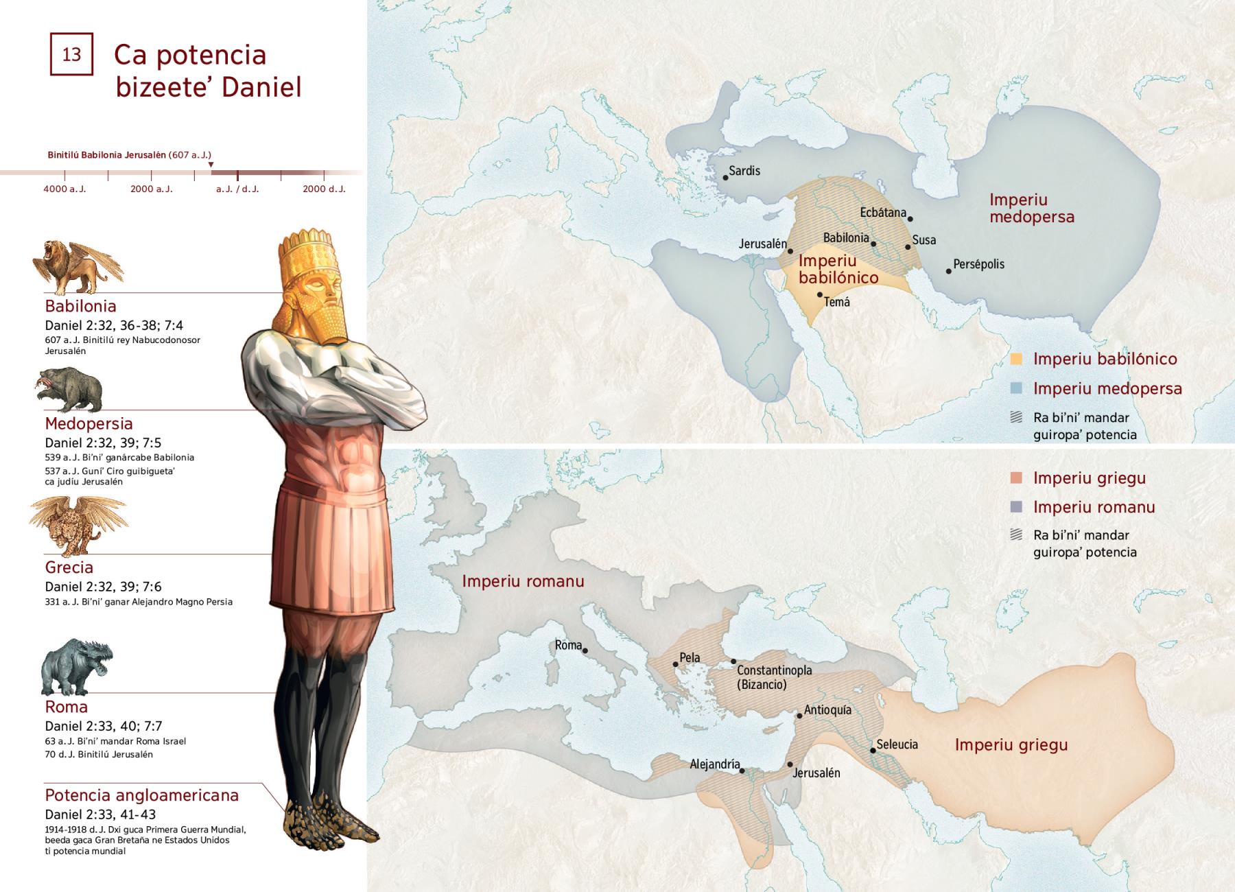 Medopersia Daniel 2:32, 39; 7:5 539 a.J. Biʼniʼ ganárcabe Babilonia 537 a.J. Guníʼ Ciro guibiguetaʼ ca judíu Jerusalén |